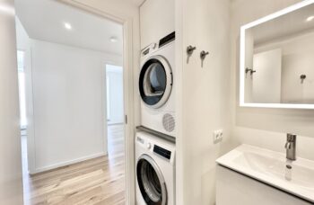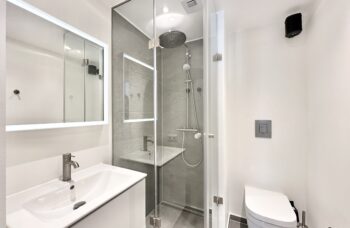 Der er flot flisebadeværelse med bruseniche og rainshower fra Grohe. Skabsarrangement med spejl fra Duravit samt egen vaskemaskine og tørretumbler af mærket Gram. Der er opsat Sonoshøjtaler i badeværelset.